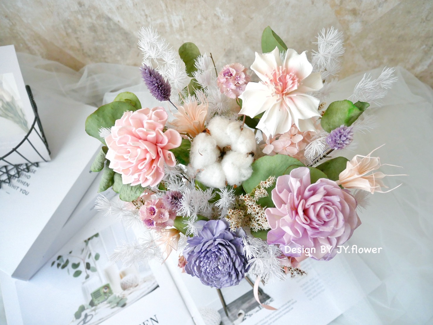 花材|主花為擴香索拉花,配花含不凋繡球花與其他季節性花材與葉材