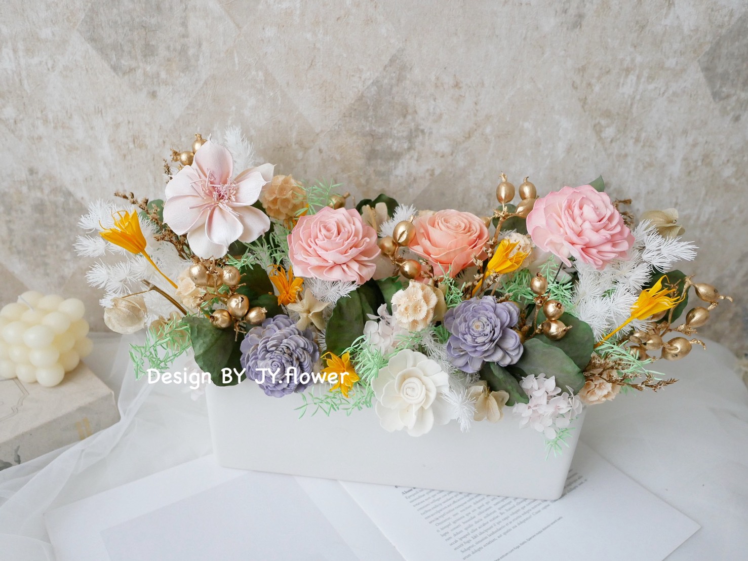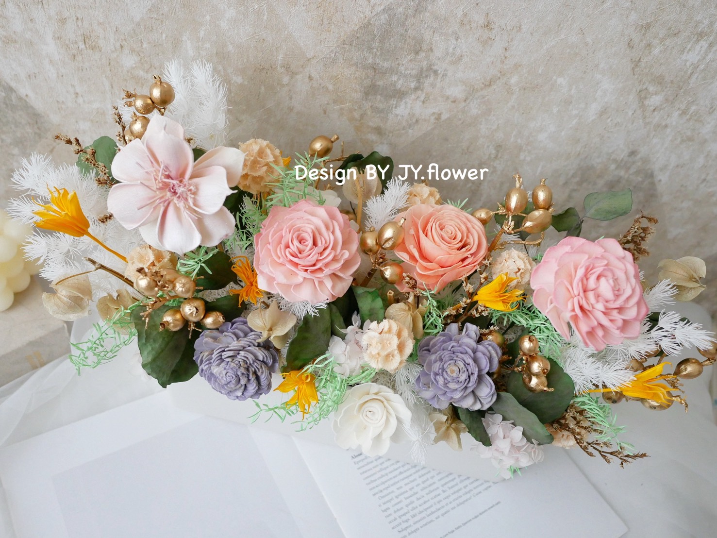 ◾ 可保存時間約為1-2年,最佳觀賞期為製作好後半年到一年的時間,之後隨時間拉長,可能有部分花朵會有褪色或是掉落的情況產生
