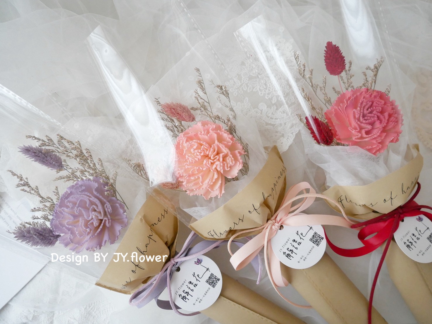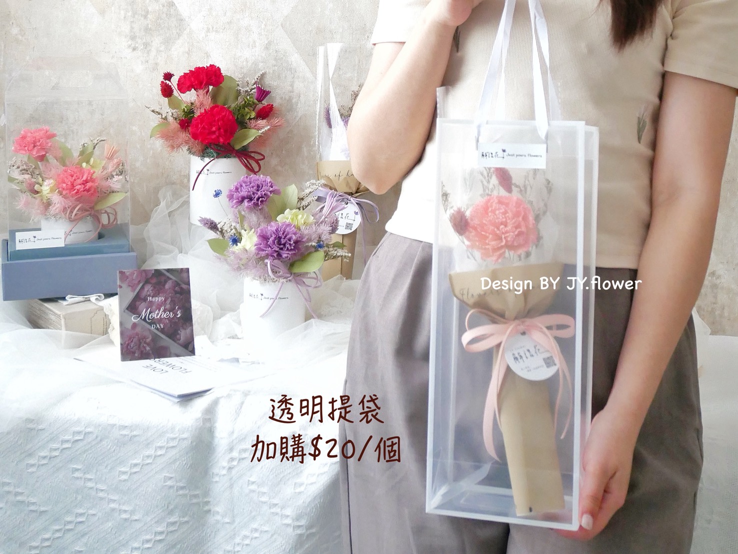 1. 單支索拉康乃馨花束$260/束,第三束開始以加購價$190計算,透明提袋$20/個,花禮將於4/21起依照訂單順序出貨