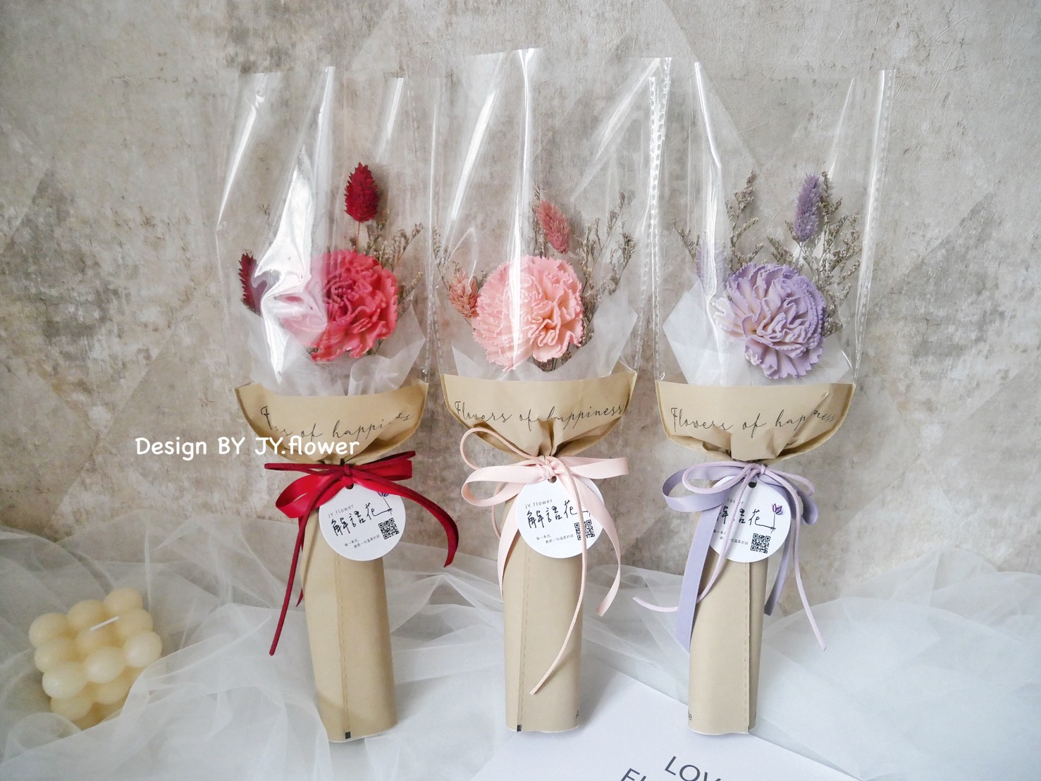 花材|主花為擴香索拉康乃馨1朵,配花為卡斯比亞與加那利